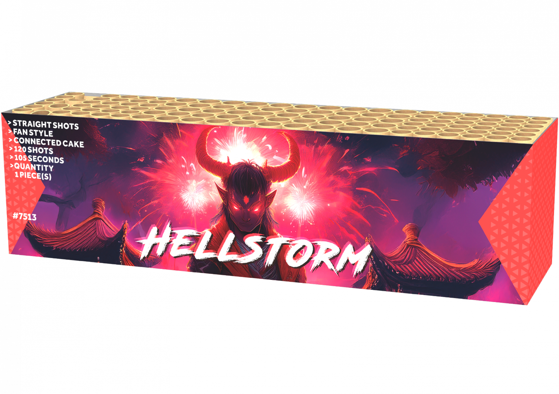 Hellstorm barst los en laat de lucht gloeien. Vanuit het donker stijgen massieve kleuren op: knalrood, helder blauw, fris groen en diep paars. Met meer dan 1,5 KG aan explosieve effecten zoals White Ghosts en Glitter Willows zet je een show neer die iedereen stil krijgt. Het rode vuur werkt als dirigent, jij bepaalt het spektakel.
