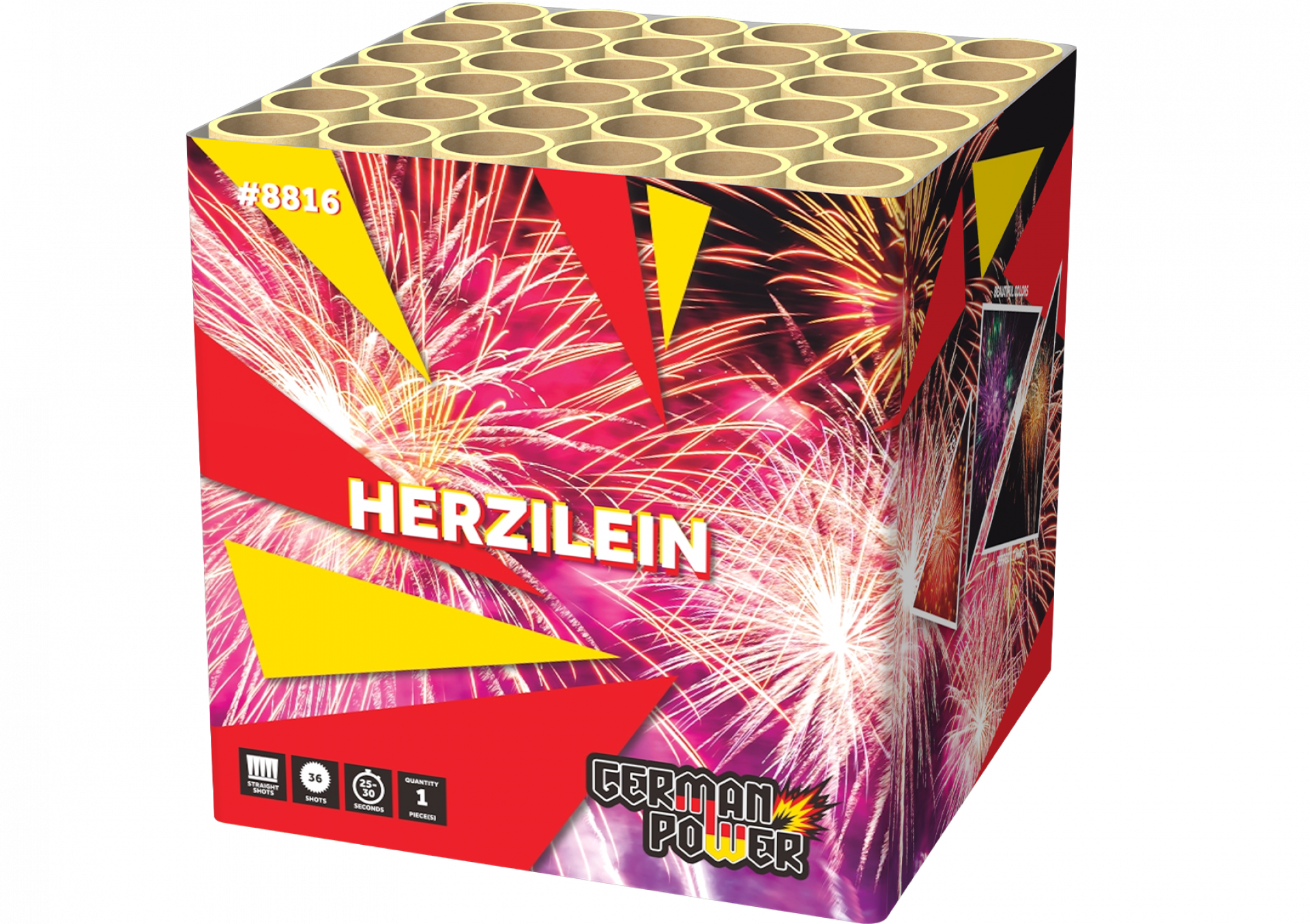 De Herzilein schiet maar liefst 36 schoten de lucht in met veelzijdige effecten zoals rode wave, witte glitter, blauwe en rode sterren en zilveren chrysanthemum.
