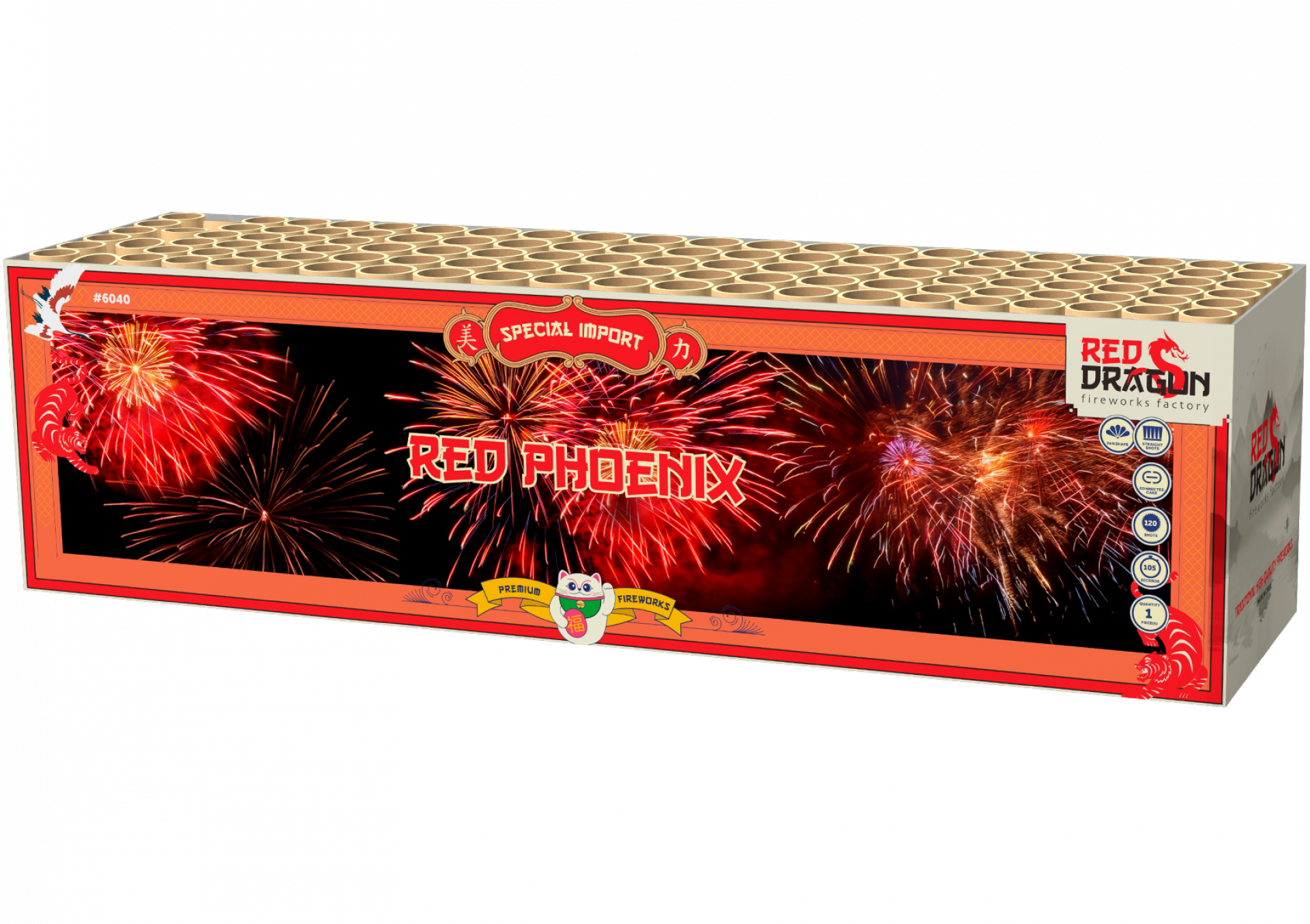 Deze vurige feniks stijgt op uit het niets en vult de hemel met diep rood, felblauw, groen en paars. Krachtige effecten zoals Glitter Willow en White Ghost maken de show compleet. Rood voert de regie. Jij de show.
