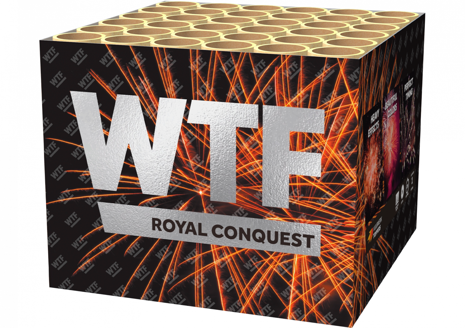 Kort maar krachtig! In slechts 15 seconden jaagt de Royal Conquest maar liefst 36 schoten de lucht in. Rode, groene en gouden crackling salvo’s volgen elkaar razendsnel op. Een echte blitzshow!